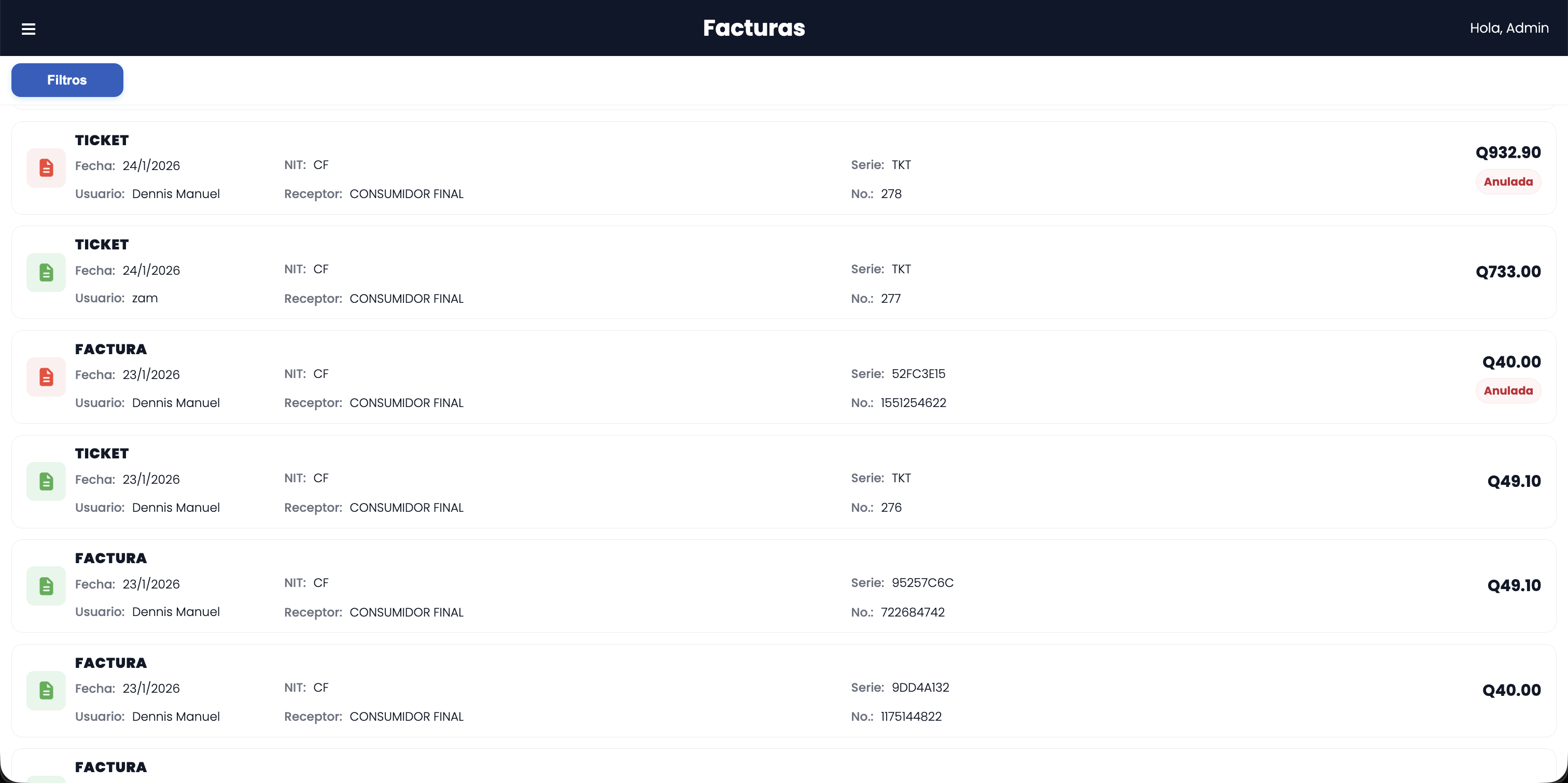 • Emisión de facturas y tickets físicos o electrónicos (FEL).